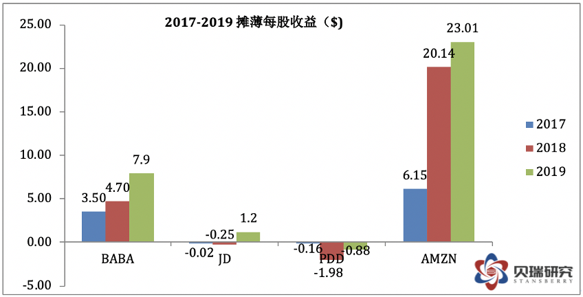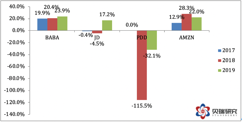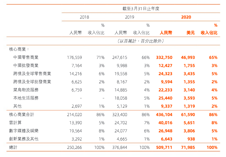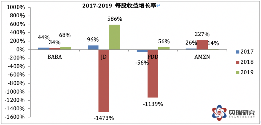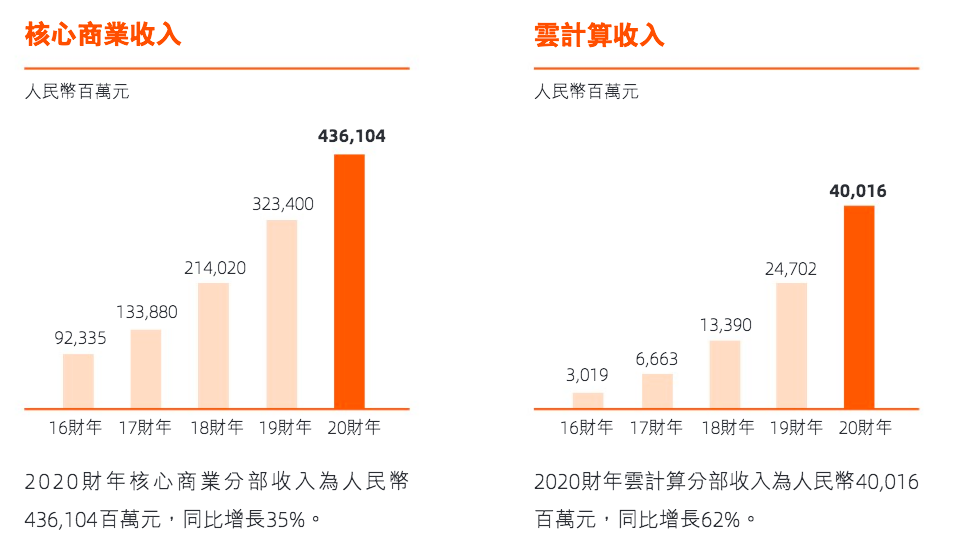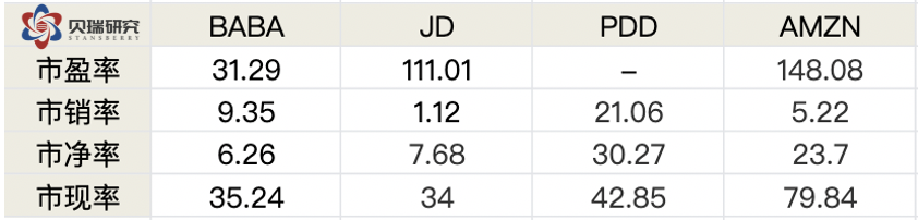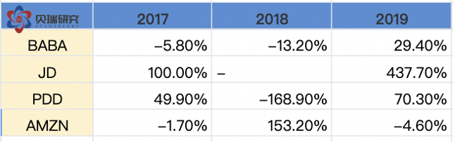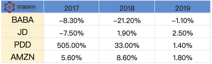 可以用四个字概括这四家公司净资产收益率的特点: 阿里:稳中有升 京东:起伏不定 拼多多:(历史过短)趋势不清 亚马逊:稳定不足 接下来再看看EPS和增长率的数据,基本上和上述净资产收益率的特点一致,四家公司中阿里巴巴不论是从EPS的增长还是增长的速度和稳定性都是四家公司中最优秀的。 (数据来源于各公司年报,作者制表) 但是,值得注意的一点是,2019年阿里的EPS增长率达到68%,这和蚂蚁集团贡献的715亿人民币的投资收益有很大的关系。这笔投资收益主要反映阿里占蚂蚁集团的股权公允价值变动。根据此前阿里披露的信息,2019年9月,阿里巴巴以人民币875亿元获得蚂蚁集团33%的股份,并确认人民币692亿元(97亿美元)的收益计入利息收入和投资净收益。第四季度上调23亿元收益后,阿里巴巴从蚂蚁集团股权交易中获得的一次性收益增加至715亿元。这笔715亿元人民币的投资收益在全年1492亿元人民币的净利润中占据48%的比重。如果我们看Non-GAAP的摊薄每股收益的增长率,可以看到同比增长只有38%。 (图片来源于阿里年报) 不久的将来,蚂蚁集团上市以后,阿里这33%的股权价值将取决于资本市场对蚂蚁的估值。可以肯定上市后当年还会大幅增值,即在下一个财年中蚂蚁还将贡献大笔的投资收益。但是,等到2021年财年(也就是阿里的2022财年),这笔投资收益很有可能会大幅降低。笔者认为蚂蚁的股权价值在未来两年将导致阿里净利润不平滑,也是阿里将来的盈利数据中的一大风险。而投资者们应该更关注non-GAAP的数据。 (数据来源于阿里巴巴2020年报) 然后,我们再来对比一下四家公司的利润率: (数据来源于雪球,作者制表) 毛利率增长率如下表: (数据来源于雪球,作者制表) 净利率增长率如下表: 从上面两组数据可以看出,作为平台型的电商,阿里和拼多多的毛利率显著高于自营型的京东和亚马逊。而阿里的净利率不仅是四家公司中最高的,也是最稳定的。但阿里面临的问题是毛利率持续下降,好在2019财年下降的幅度有所收窄。而净利率方面,由于受益于蚂蚁集团贡献的一次性投资收益,2019财年的净利率相比前两年有所提高,净利率增长率也由负转正。 这两组数据中,京东的利润率最让人担心,不仅是利润率水平低下,关键是没有明显的改善趋势。而拼多多的毛利率惊人的优秀,2018年已经高达77.9%的毛利率,所以我们也不能期望拼多多毛利率出现大幅增长了。2019年高达79%的毛利率应该很接近天花板了。拼多多净利率方面也有明显的提高。至于今后的发展趋势,我会在后面的业务分析中再一一拆解。而亚马逊的利润率方面,由于市场也发展到了一个瓶颈期,利润率的增速明显放缓,甚至下滑。如果没有AWS,亚马逊的利润率会很低,甚至重回亏损。 财务比率的分析部分,我们最后再看两组数据,即负债权益比和营收现金比: (数据来源于英为财情,作者制表) 不难看出,阿里是四家公司中负债率最低的公司,而阿里的FCF/S(现金营收比)也仅仅低于拼多多,明显优于京东和亚马逊。当然,这组数据的分析仍旧要回到业务模式的差别上来。因为京东和亚马逊需要自建物流和仓库,相对阿里和拼多多来说,固定资产比重高,因此负债率高。而由于这两种模式确认营收的方式不同,京东和亚马逊的营收基数大,因此现金营收比很低。 通过上述的财务比率分析,我们可以得出结论:不论是这些财务比率本身,还是它们的增长率,阿里几乎都是四家公司中最优秀的,除了利润率的增速下降这一点。 到此,价值分析部分结束,我们可以回答前面的问题了:阿里巴巴的股票估值偏低,净资产收益率高且稳定,盈利稳中有升,现金流充裕,资产负债率低,资产安全边际高。而所有这些,正是价值投资者追求的指标。 接下来,我将从业务分析的角度,和大家探讨另一个问题:阿里巴巴的成长性如何? 业务分析角度谈阿里巴巴的成长性 说句实话,要分析阿里的业务,根据阿里年报里的业务概览图,要展开分析的话,先不说有没有这种覆盖全面业务的分析能力,就体量来说,估计是一本书的体量,甚至还得分上中下三集。所以,放在一篇报告里,我们只能抓大放小,抓关键。 (数据来源于阿里巴巴2020年报) 我们的业务分析将以此图为向导,同样以横向和纵向比较来展开。首先,我们先来看阿里的年报,年报中把最重要的数据都进行了纵向对比。 连续三年,阿里的核心商业(包含零售、批发、跨境、物流和本地服务)都占总营收的86%,在营收老大的位子上无可替代,而且这部分也是阿里唯一盈利的业务。过去的一年核心商业同比增长35%,和总营收的增长幅度保持一致。阿里云过去一年表现也非常好,占总营收比从7%增加到了8%,过去一年的营收达到400亿人民币,同比增长高达62%,是阿里四大业务分部中增速最快的业务。