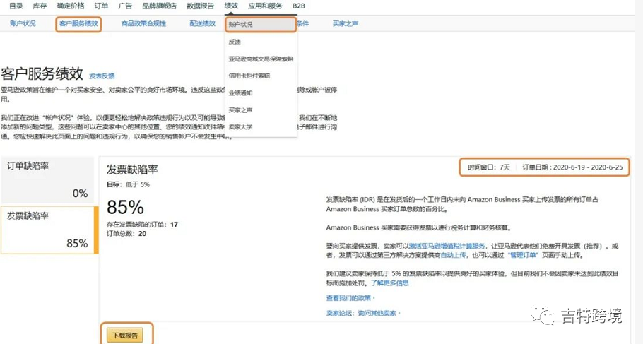 登录【卖家平台】>点击【绩效】>查看【账户状况】>选择【客户服务绩效】>查看【发票缺陷率】这里查询到发票缺陷率(IDR)指标。