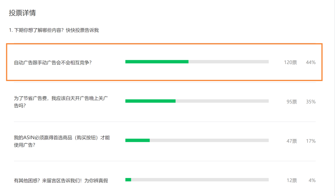 感谢大家的厚爱!上一期我主持的栏目的支持率达到了99.9%!我会再接再厉的!最近我在默默收集大家的声音,第一期投票中超过4成的卖家都想了解:自动广告和手动广告会竞争吗?