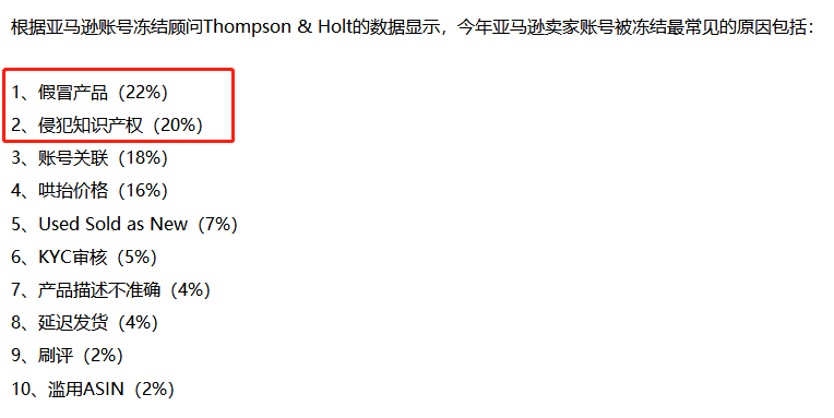 假冒伪劣产品在亚马逊上泛滥,根据亚马逊账号冻结顾问Thompson & Holt的数据显示,今年以来亚马逊卖家账号被冻结最常见的十大原因中【假冒产品】占比22%位居榜首。