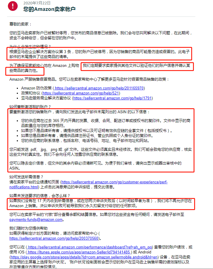 1.因为亚马逊企业解决方案协议第三条,卖家销售的商品可能是仿造或假冒的,所以卖家账户被停用。