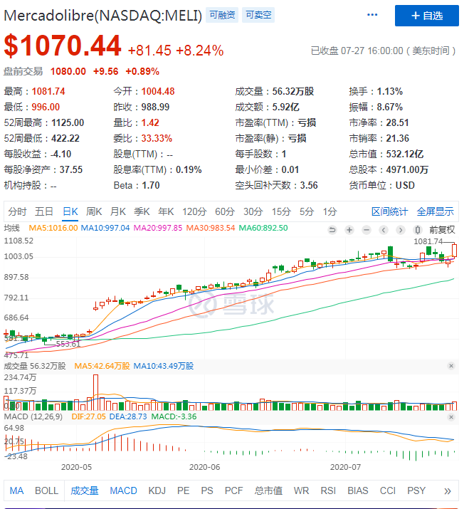 在众多电商股中,以拼多多、SE、Meli作为中国、东南亚和拉丁美洲的新兴电商三巨头PSM在疫情期间的表现最为出色。开年至今,拼多多上涨超120%,SE股价上涨超180%,MercadoLibre股价上涨超87%。