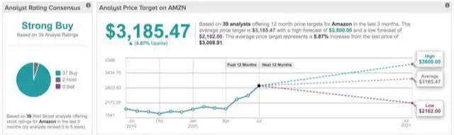 亚马逊股价年初至今上涨63%,分析师共识为强势买入,分为37个买入评级与2个持有评级,没有卖出评级。3185.47美元的平均目标价意味着未来12个月该股有6%的上涨潜力。