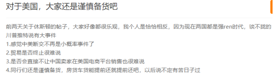有卖家联系当前的国际大环境,发帖称:对于美国,大家还是谨慎备货吧。