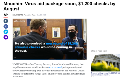 本周日的时候,美国财政部长 Steven Mnuchin 表示,共和党人将在下周一推出下一个 COVID-19 援助计划,并保证得到白宫的支持。他同时还表示,新一轮1200美元的经济刺激计划将于8月出台。