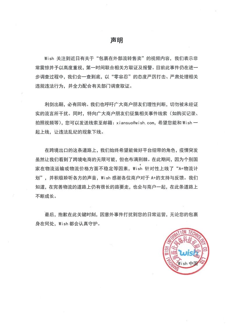 关于近日的“包裹在外部流转售卖”的视频内容,Wish发布声明如下: