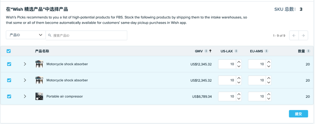 从“Wish精选产品”中选择产品 一 1、关于“选择入仓地区” 特别说明 FBW项目和FBS项目会整合资源,以便为商户、用户提供更加优质的最后一公里的物流体验,因此,目前FBS项目在某项方面仍依赖于FBW的仓库功能。尤其是,各位商户从“Wish精选产品”中选择产品加入FBS后,会在FBW仓库创建FBS库存配送计划。