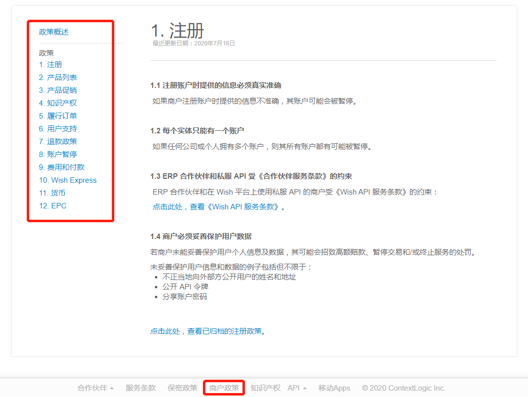 附:一个重要更新! 为了方便商户了解Wish平台的最新政策,Wish对“商户政策”页面进行了重组,包括“政策概览”和“政策”页面,各位商户可以登录https://merchant.wish.com/policy/home 查看现行的商户政策。 重组后的政策页面与原页面内容基本一致,各位商户也可以进入每一项商户政策页面,点击页面底部的脚注,查看相应政策的历史信息。 小编建议各位商户认真阅读重组后的商户政策,在实际的店铺运营中遵守各项政策条款,健康运营、稳步发展。