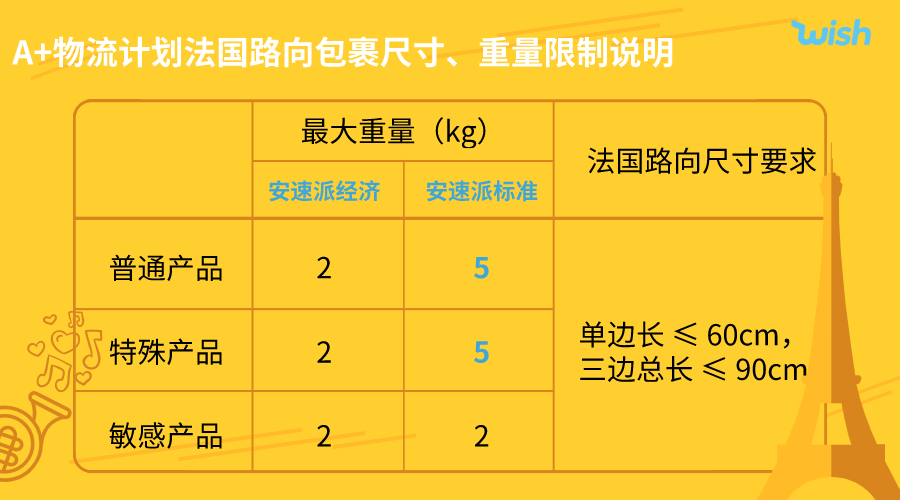 为了支持商户们更多样的产品发展需求,Wish提高了A+物流计划法国路向“安速派标准”渠道的包裹最大重量限制要求:普通产品、特殊产品的最高重量提高至5千克(原来为2千克),敏感产品最高重量不变,依旧为2千克。