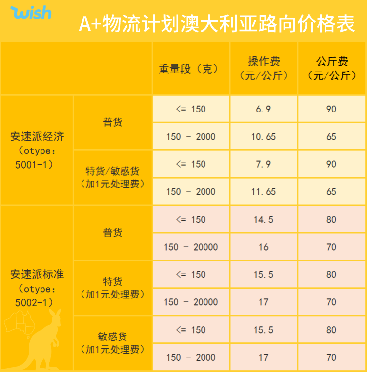 旺季未到,物流先行。随着旺季准备工作的开展,Wish也在持续关注各个路向的物流情况,继续为商户提供更好的旺季物流服务。A+物流计划澳大利亚路向将使用更优质的物流渠道,以提升物流时效及服务,据此,Wish也对A+澳大利亚路向进行价格调整。调整后的物流价格适用于北京时间2020年7月31日上午10时后在WishPost中创建的A+澳大利亚路向运单,调整后的物流价格如下: