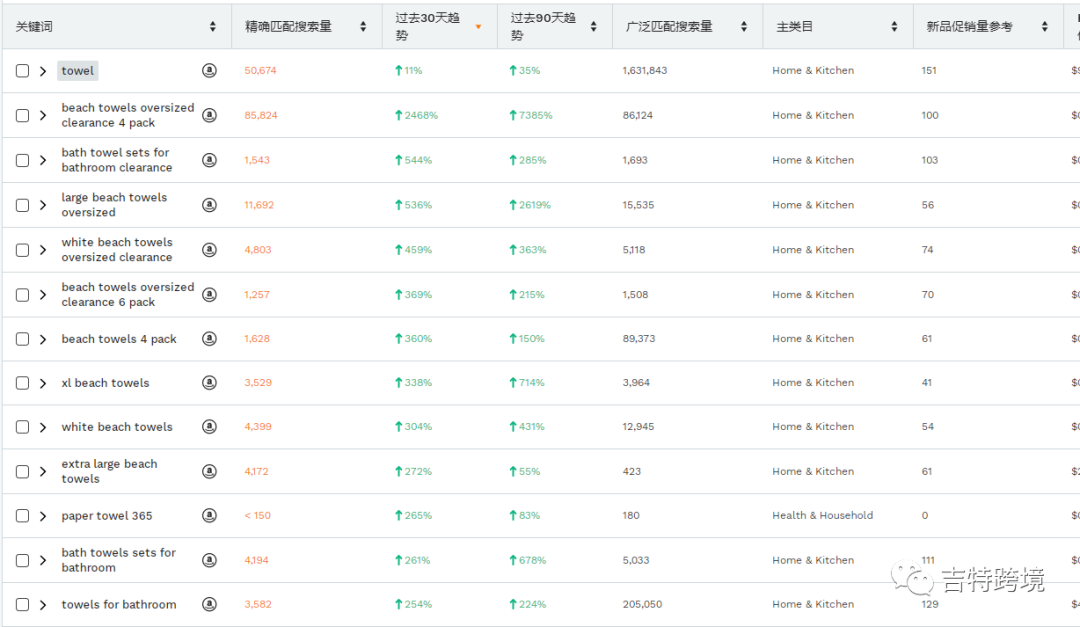 通过JS搜索毛巾相关的关键词,在过去近30天和近90天里,均呈现出很强的上升趋势,其中”beachtowels“近30天内搜索量上升了2468%。
