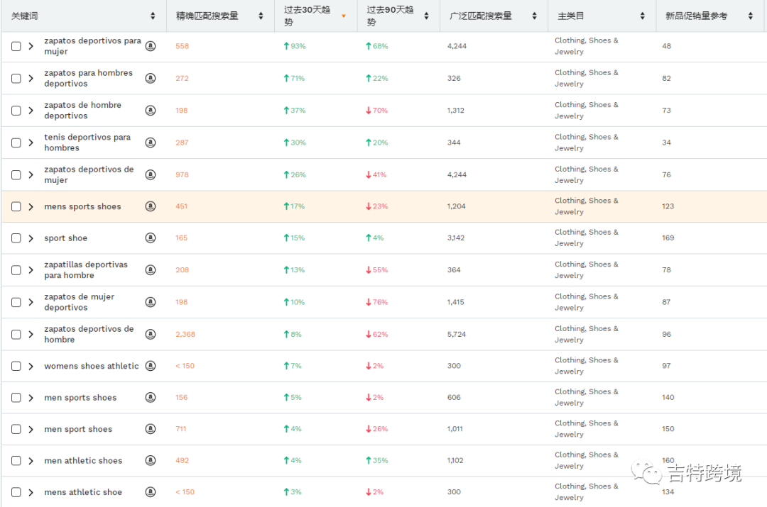 选品建议:以运动鞋为例,在JS关键词排行榜中,和运动鞋相关的关键词近30天都呈现上升趋势。