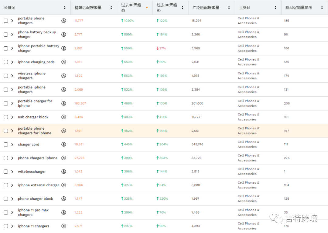 通过JS搜索充电器相关的关键词,在过去近30天和近90天里,均呈现出很强的上升趋势,其中”portablephone chargers“近30天内搜索量上升了1020%。