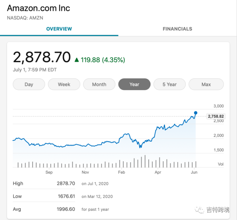 据相关数据显示,由于疫情缘故,欧美国家线上零售持续上升,亚马逊交易额持续高涨。股价丝毫没受到新冠疫情的影响,一再刷出历史新高。