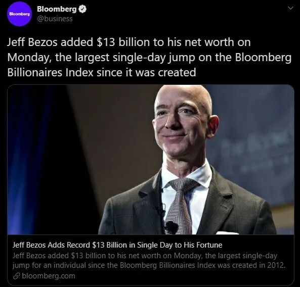 北京时间7月21日早间消息,据外媒报道,本周一,杰夫·贝索斯(Jeff Bezos)的财富一天内增长了130亿美元,这是彭博亿万富翁指数自2012年以来所记录的最大的单日涨幅。 当日,亚马逊的股价大涨7.9%,这是自2018年12月以来最大的单日涨幅。进入2020年以来,亚马逊的股价已经上涨了73%。 2020年迄今,尽管疫情导致美国经济陷入了大萧条以后最严重的危机,但是56岁亚马逊创始人、世界首富贝索斯的资产依然增加了740亿美元,至1893亿美元。如今,他的个人资产甚至超过了一些著名企业的市值,例如埃克森美孚、耐克和麦当劳等等。