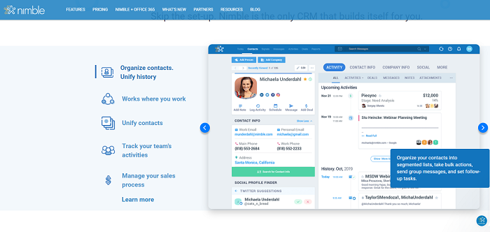 Nimble 客户信息管理 Nimble是一款LinkedIn营销必备工具, 也是中小企业最受欢迎的客户管理工具。它为经常更新资料的联系人设置单独列表,使你可以轻松浏览;也可以整理联系人清单并推荐与他们联系的最佳方式,从生成您的潜在客户清单。Nimble还提供了一个选项,可以显示你的日历和预定事件,为销售人员节省大量时间,使他们专注于与客户建立联系。 工具提供14天免费试用,并支持年付(19美元/月)与月付(25美元/月)两种付款方式。