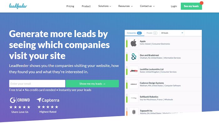 Leadfeeder 跟进用户访问内容 将这款工具连接到你的Google Analytics账户,你可以识别访问你公司的网站,并跟进他们访问的内容,数据将会同步到你的CRM,且会收到邮件提醒。这可以帮助你识别潜在客户,在与客户沟通之前预测需求,并且快竞争对手一步推动销售。 该工具的体验版可免费试用,但仅显示过去3天的数据,高级套餐的费用为55美元/月。