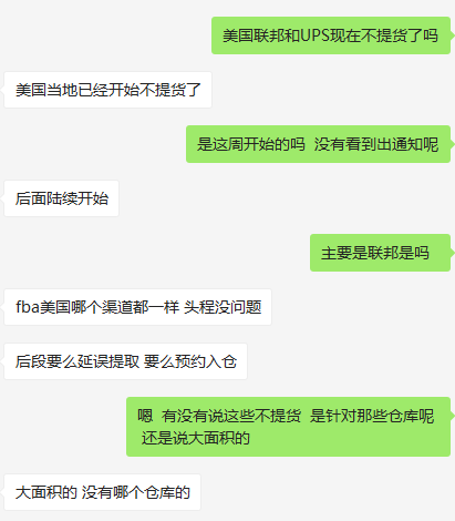 在卖家谈及派送时效时,一位货代人员表示,美国现在80%的UPS、联邦卡车在亚马逊仓卸不了,这个星期起已经开始不提货了。