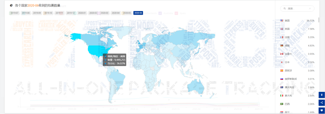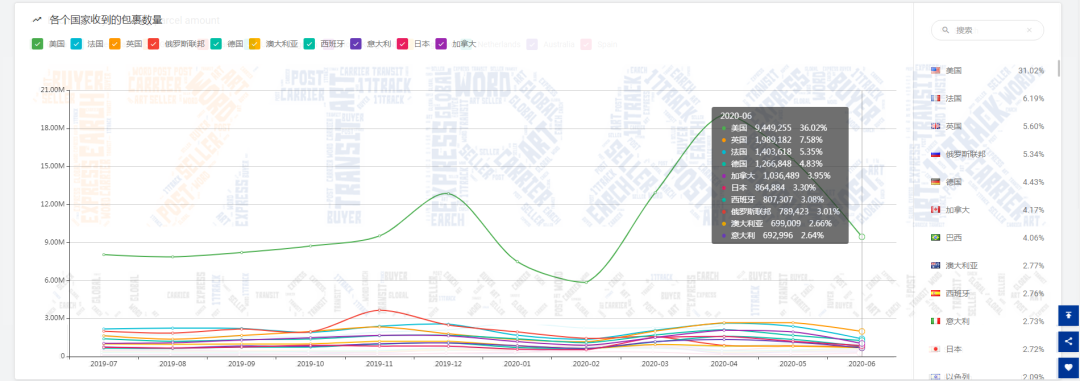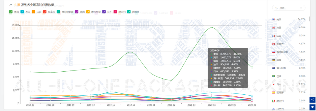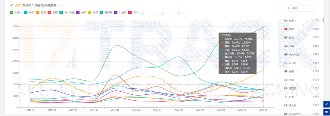 注:美国邮路发出的包裹,发往加拿大的数量持续上升,已经是连续第4个月上涨;另外发往巴西的数量也是连续第4个月上涨;同时是美国邮路中发往的前2个主要国家;发往中国的数量与5月份相当