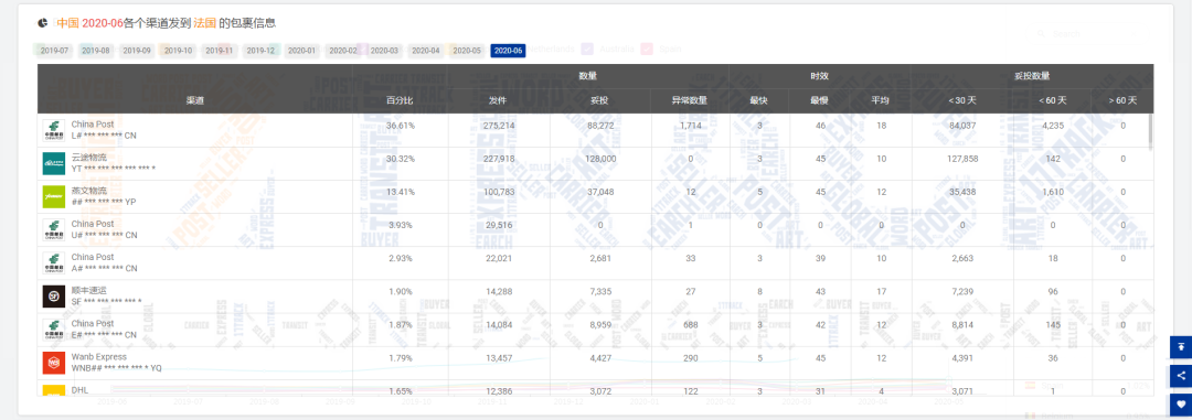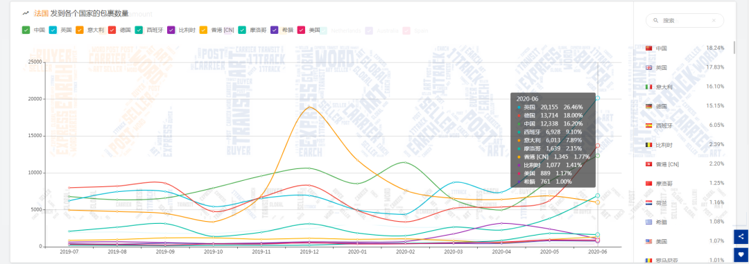 注:法国邮路发出的包裹,较5月份下降了21.46%,但是前5个国家中,仍然有4个国家的数量是上涨的,分别是英国、德国、中国、西班牙,其中英国占26.46%