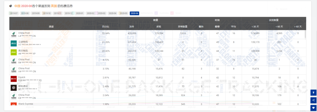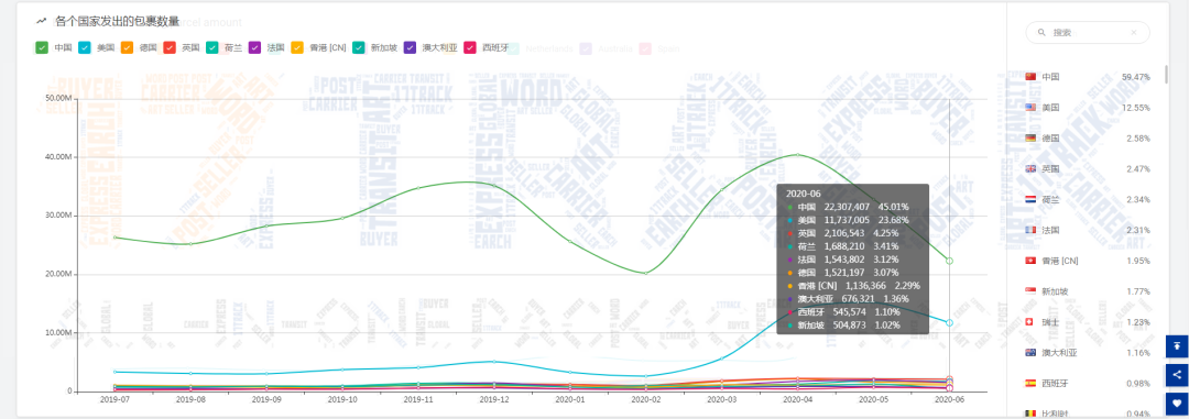 2020年6月,平台总共收录查询单号超过4,956万票,其中发件的国家及地区为218个、收件的国家及地区为228个。