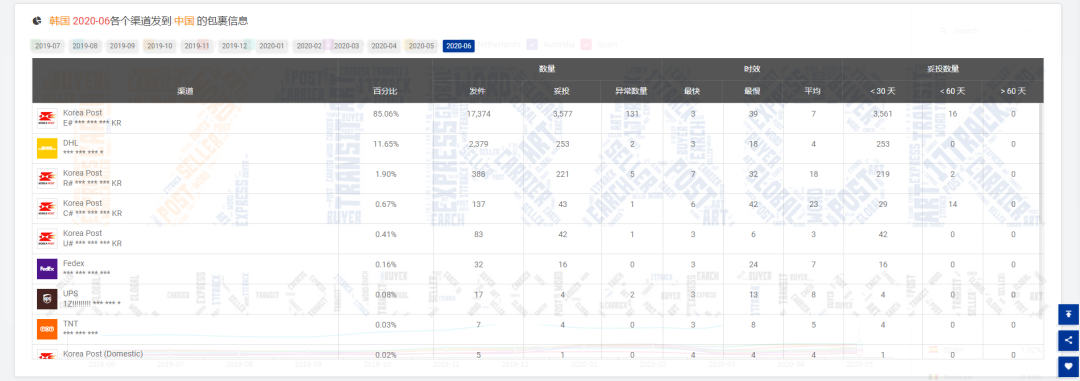 取样[韩国邮政EMS]妥投率为20.59%,占比为85.06%