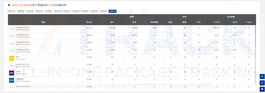 取样[香港邮政EMS]妥投率为34.70%,占比为92.12%