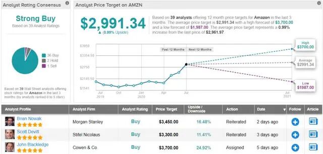 在经历了长时间的大幅上涨后,亚马逊(AMZN)的涨势似乎正在暂停。上周,亚马逊的股价在每个交易日结束时都出现了亏损。不过,在亚马逊本周(7月23日星期四)公布第二季度财报之前,Stifel分析师Scott Devitt建议投资者对这家电子商务巨头的股票采取行动。这位五星级分析师预计,亚马逊股价很快就会恢复上涨。Devitt对AMZN的评级为“买入”,目标价为3300美元,这意味着该公司还有11.5%的涨幅。亚马逊的股价不太可能长时间保持下跌趋势。随着冠状病毒病例的再次上升,就地避难措施再次实行,亚马逊可能还将从中受益。Devitt提到了这一点,他说:“亚马逊是大流行导致消费者购物行为转变的主要受益者。经济重新开放的速度比之前预期的要慢,这对亚马逊相对于传统零售业的竞争地位是有利的,也增加了消费者的行为发生永久性改变的可能性。”Devitt展望新财报,预计亚马逊将公布第二季度收入为809亿美元,同比增长28%,符合亚马逊指引的上限(750亿美元至810亿美元),并反映了华尔街的预期。在大流行期间,亚马逊为了满足需求并确保工人的安全,曾宣布将在第二季度投入了40亿美元。因此,Devitt预计这一额外支出将对运营收入产生影响。Devitt预计运营收入将为9.55亿美元,低于华尔街预计的11.8亿美元。不过,这位分析师认为关注重点主要集中在亚马逊第三季度的前景,以及该公司打算支出多少资金来支持更高的需求,并确保一个安全的工作环境。Devitt总结道:“由于投资可能会影响短期成本结构,第三季度利润率的前景可能会弱于当前的预期。”在华尔街,亚马逊仍然像以前一样受欢迎。1个“卖出”和2个“持有”被37个“买入”看涨大大超过,所有这些加起来都是一个强烈的“买入”共识评级。不过尽管如此,在亚马逊股价持续飙升之后,2991.34美元的平均目标价较当前股价只剩下1.5%的上行空间。