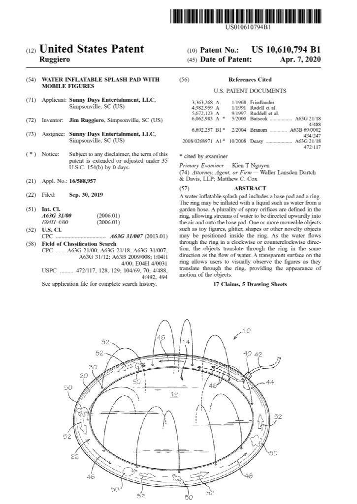但小jude既然介绍得了这款产品,就肯定是查到有相关的专利。目前这款splash pad已经查到有一家叫SunnyDays Entertainment, LLC的公司注册了美国专利。