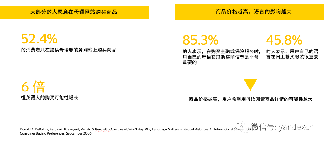 据美国调查公司 Common Sense Advisory 的消费偏好研究数据表明,超过一半(52.4%)的消费者只在提供母语服的务网站上购买商品。在英语网站购买商品时,英语掌握情况起决定性作用 ——在这种情况下,懂英语人的购买可能性会增长六倍。