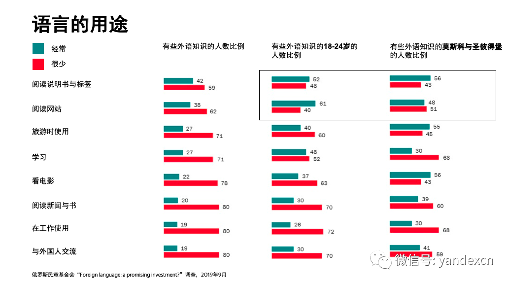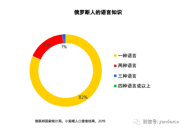 虽然俄罗斯是有潜力发展业务的市场,然而它有一些必须要考虑到的特征。其中之一便是语言掌握情况。99% 的俄罗斯居民讲俄语。82% 的俄罗斯人只会讲一种语言,17% 的人会讲两种语言,1% 的人讲三种语言。