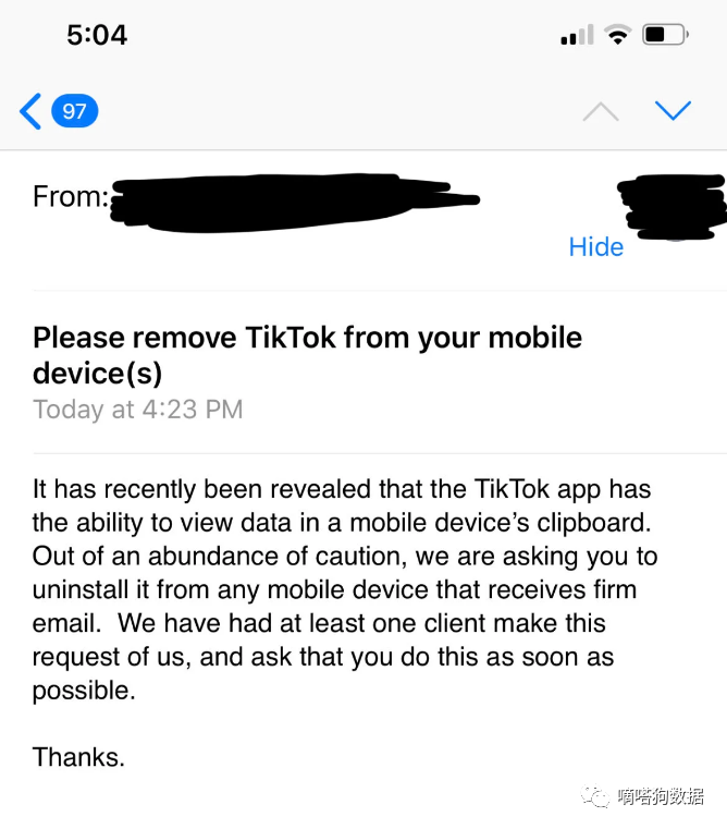 有消息显示,TikTok以及其他许多应用程序正在监听设备剪贴板上的任何内容,其中可能包括敏感的客户端信息。TikTok以及其他一些应用程序都承诺将取消这种做法。但是,根据Ars Technica的一份报告,TikTok在他们表示将放弃这种做法后仍有监听行为。所以,Biglaw公司希望员工关闭TikTok,或者从电话中删除TikTok