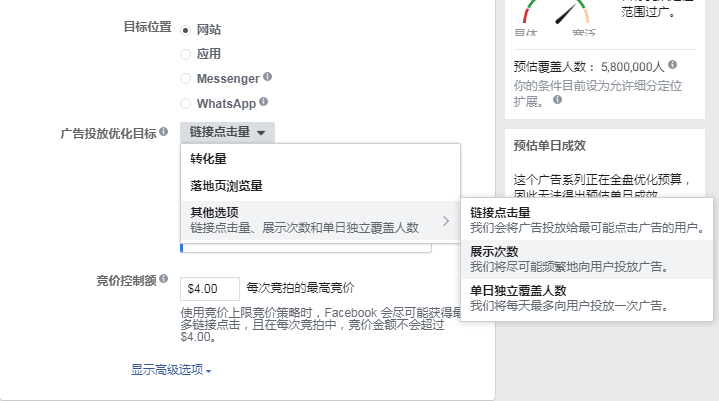 展示收费(Impression):按照广告的展示次数收费,即你的广告展示出去了,Facebook就会进行收费