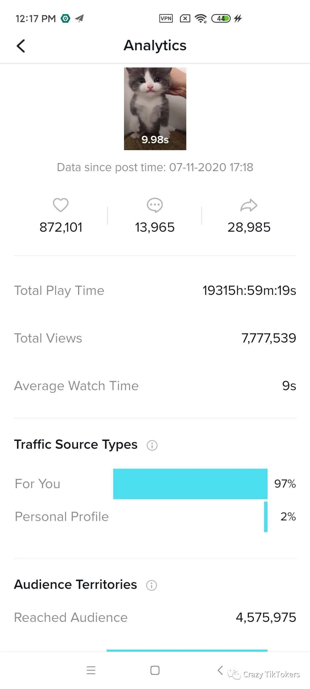 for you流量占98%,777万次观看次数等说明这个视频确实进入了全球流量池里了。我知道有人单视频做到了2000万的播放,涨粉可能在1-2万,所以粉丝的转化率也是衡量我们视频质量的一个非常重要的因素。