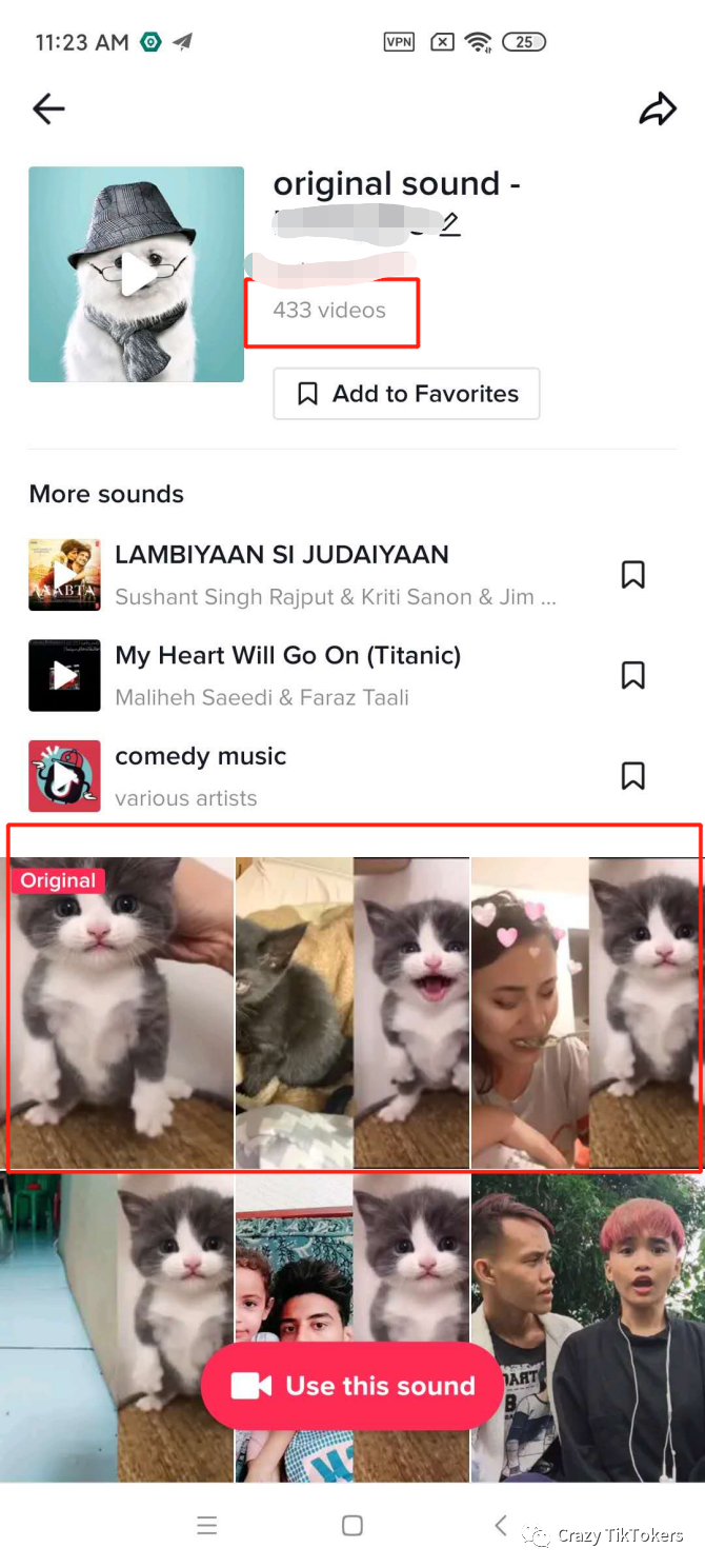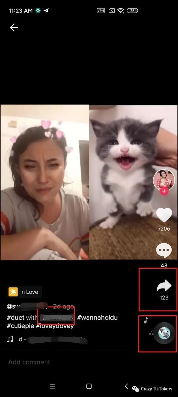 4. 音乐BGM的搭配:我没有选择音乐,而是用了原声,这样更能有带入感,小猫的叫声加上表情和动作,更能引起人们的关注。另外,我每一条视频,都会选择把背景音乐做为原始音乐,这样只要视频爆起来,就会多一条流量入口,因为跟你合拍的或者使用你音乐的人会很多,所以他们也是你的一个传播者。(下面几张图红线圈起来的地方大家看一下)