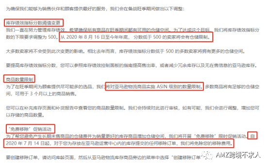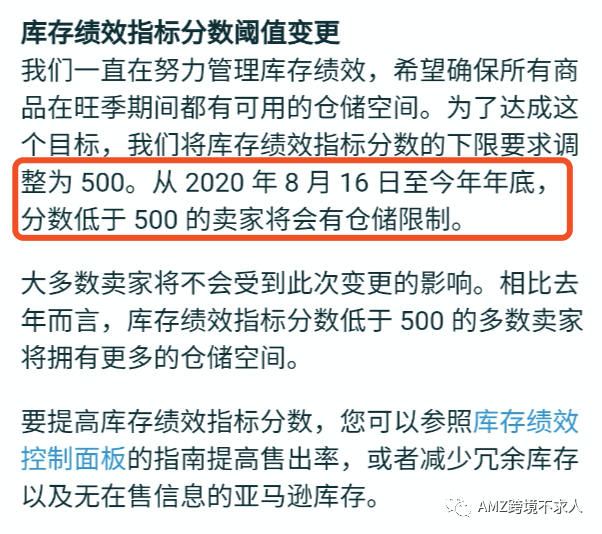 相比这次不求人觉得影响最大就是库存绩效指标分数阈值变更, “确保所有商品在旺季期间都有可用的仓储空间。为了达成这个目标,我们将库存绩效指标分数的下限要求调整为500。从2020年8月16日至今年年底,分数低于500的卖家将会有仓储限制。大多数卖家将不会受到此次变更的影响。相比去年而言,库存绩效指标分数低于500的多数卖家将拥有更多的仓储空间。“