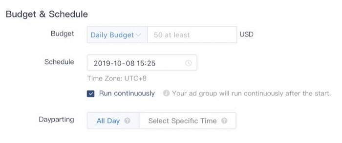 接着设置广告预算,可设置每日预算或总预算。除此之外,你还可以根据不同的投放市场,自行安排广告投放的时间和频率,以保证它在目标市场的稳定曝光。