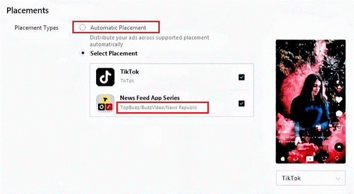 接下来,为广告选择需要投放的平台。TikTok允许客户手动添加想要投放的相关应用程序(例如:TopBuzz, BuzzVideo, News Republic等),也可以设置为自动模式,该模式下系统会根据你投放的广告内容,自动识别并将其投放在最佳位置。
