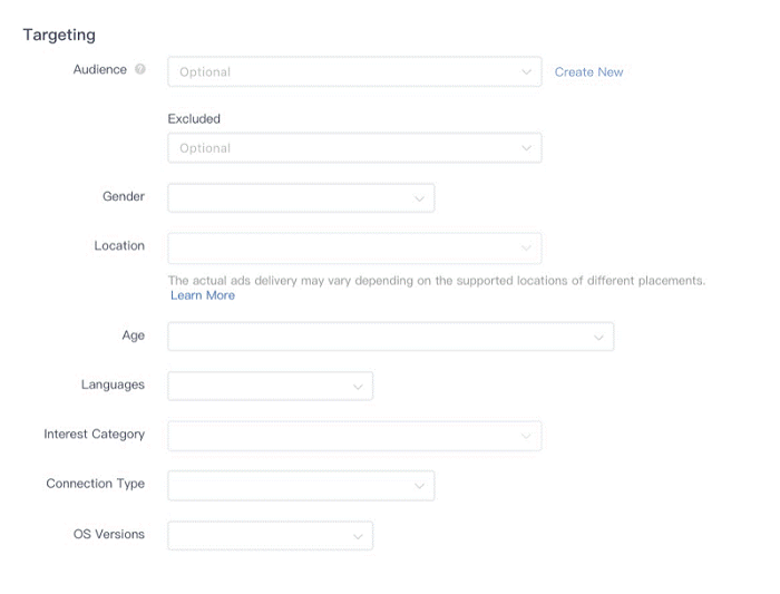 下一步就是填写广告定位相关信息,如果你对产品的受众有比较清晰的认知,这一步将帮助你更加精准地定位客群,使推送的广告更有效率。定位信息涵盖面广,包括目标受众的年龄、性别、所在地、语言、兴趣、常用设备等。TikTok还支持上传现有用户ID来自定义受众,十分方便。