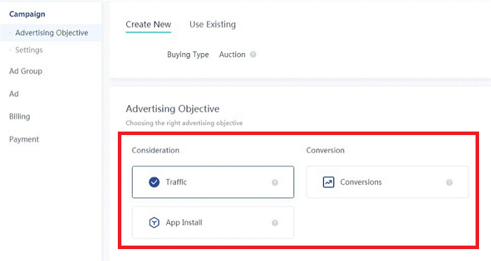 进入到设置页面后,你需要选择一个广告投放目标,根据自身情况思考你想通过投放广告实现什么,在流量(Traffic)、转化(Conversions)和应用安装(APP Install)中进行选择。