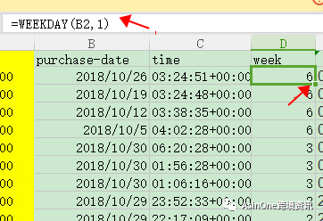 7:在week(自己命名) 下方输入函数 =WEEKDAY(B2,1),然后双击小十字架,全部算出星期;