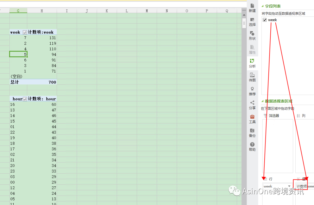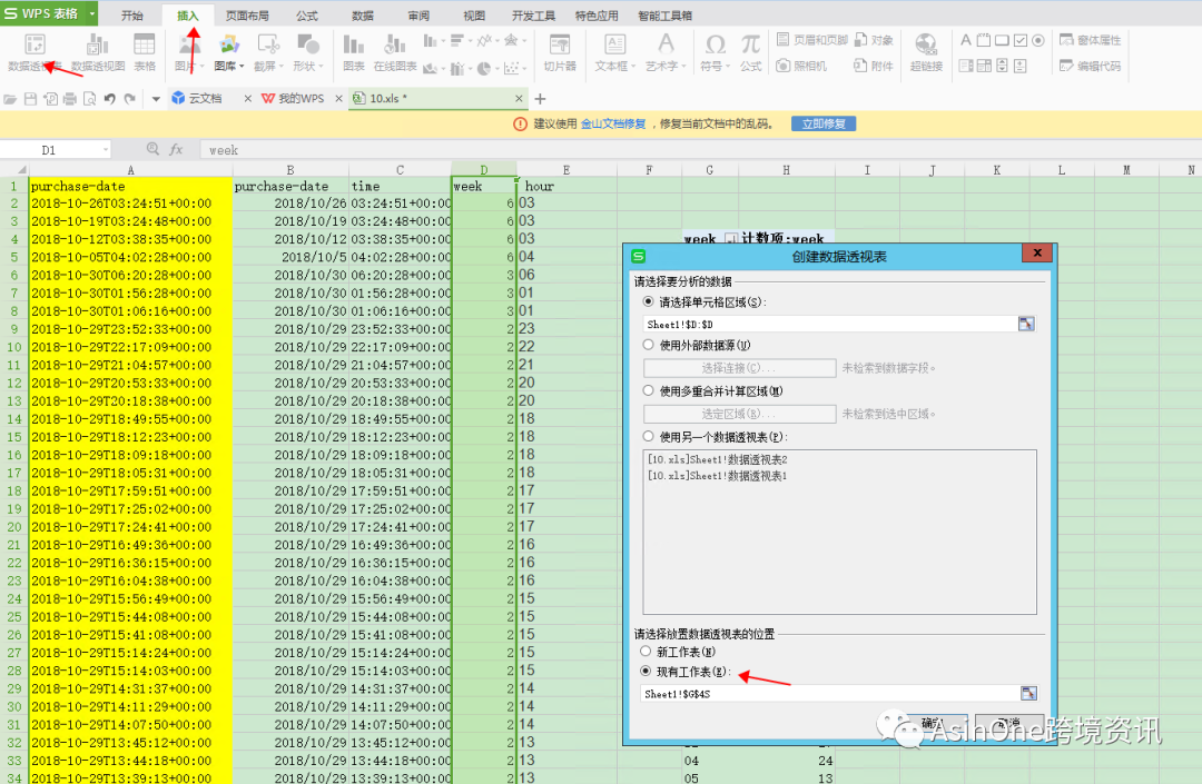 8:选取 week 列, 选择**->数据透视表,选取要透视的数据列,选择 位置为 现有工作表;