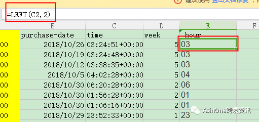 10:筛选出最佳 LD时间,在hour(自己命名)下方输入函数 =LEFT(C2,2), 筛选出需要的时间,然后双击,全部填充;