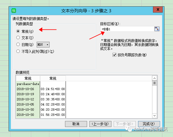 6:该步骤 设置数据类型 选“文本”,目标区域 将 其中的 “A” 修改为“B”,意思是将分列出来的数据 从B列开始导入,这样不会覆盖原有的A列的数据;然后点完成。
