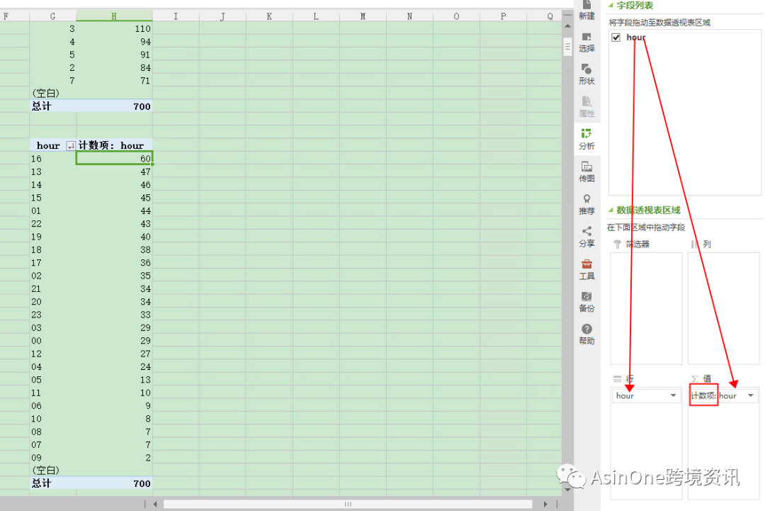 12:将 hour 分别拉入 行 标签和值 标签, 值选项 选择 计数项,而不是求和项