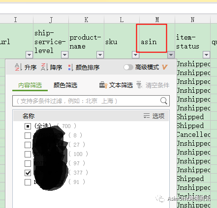 2:将下载的多个表格汇总在一个表格里,选择“order status”,排除“cancelled”订单;选取我们的目标asin;