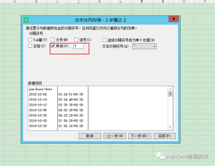 5:在分列导向的时候, 将 其他 选项中填入“T”,将日期和时间分开,然后点击下一步