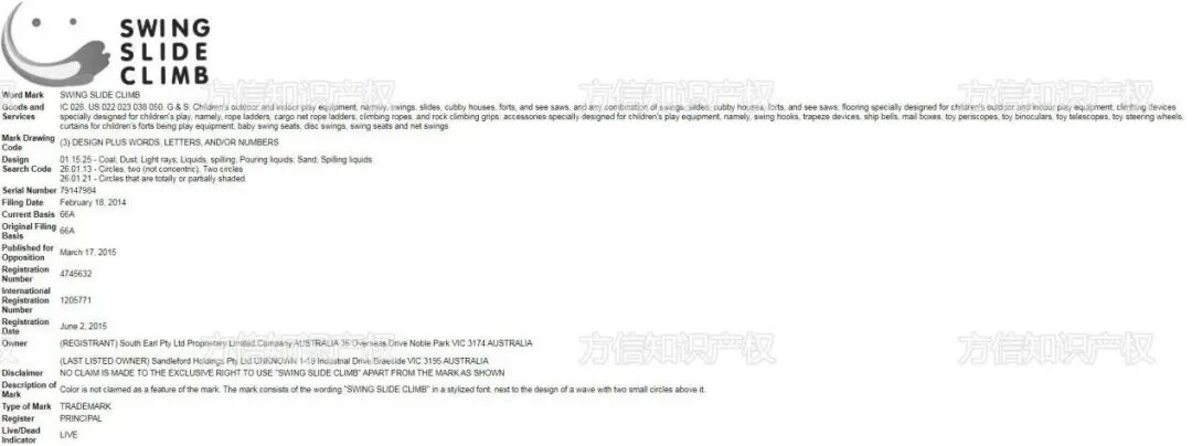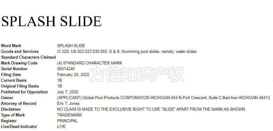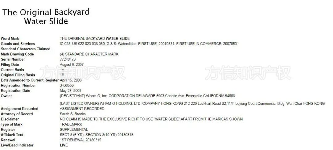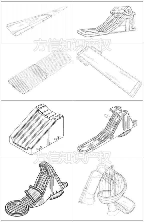 最近三个月的谷歌趋势也明显显示为增长趋势,热度up! 但是,跟热度一起上涨的还有大家熟悉的侵权风险,那么这款产品有哪些潜在侵权风险呢? 需要关注的第一个问题是,是否存在关键词侵权?有没有人已经申请waterslides 为商标名称呢?经过检索发现,美国28类中有两个商标名称中含有 waterslide 这样的描述,即MY1ST WATER SLIDE和THEORIGINAL BACKYARD WATER SLIDE 。 可以看到两个商标中的产品都是关于水滑梯的,但都被要求放弃 WATERSLIDE 的商标专用权,所以就关键词上基本不必担心用了WATERSLIDE就会涉及商标侵权。 但仍需警惕一些描述性的词语如 splash,SWING 和 slide 滑梯的结合类描述,有可能相似商标正在申请中或者已注册,如 SWINGSLIDE CLIMB 和 SPLASHSLIDE 。 (美国商标MY1ST WATER SLIDE) (美国商标THEORIGINAL BACKYARD WATER SLIDE) (美国商标SPLASHSLIDE) (美国商标SWINGSLIDE CLIMB) 跟此前介绍过的飞溅垫一样,外观设计是最危险的侵权点。在美国和欧盟都有不少关于水滑梯的外观专利。 (部分美国水滑梯外观专利) 新近申请的美国外观专利,可以看出相比之前的高耸的滑梯,更加贴近地面并且摘除了水池的部分,更加简易方便,在小庭院中更加施展得开。 此外,也会强调两侧的边边可以形成滑梯的水流。故想要销售相似的产品更要注意一下热门产品的设计方向,避开相似点,准备上架的朋友们也应做好相关了解,不使用他人官网产品图片,了解是否是他人专利产品。 今夏盛行的又一款水元素产品——水滑梯,依然是风险与机遇并行,选品的时候需注意: 虽然 water slide 基本不会造成关键词侵权,但需要关注一些擦边球的描述性词语,如正在公告的 splash slide ,避免关键词被抓 版权侵权主要是其他品牌的官网图片,可远观而不可挪用 外观专利是重中之重,如果是自主设计产品,今早申请相关外观专利保护;如果是第三方销售,需在上架前做好市场知识产权相关调查,避开相似产品风险