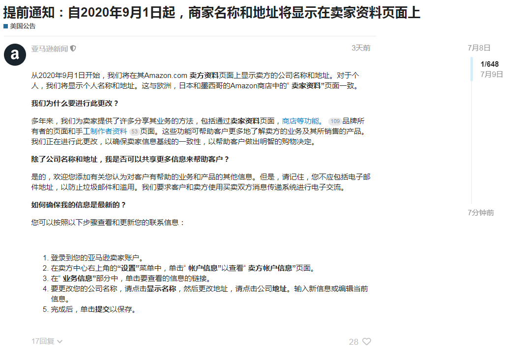7月8日,亚马逊美国站发布了一则通知:自2020年9月1日起,卖家名称和地址将显示在“卖家资料”页面,这将与欧洲、日本和墨西哥站点中的“卖家资料”页面一致。
