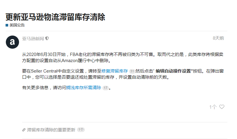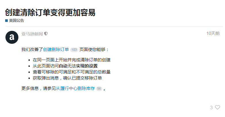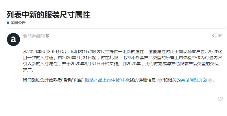 亚马逊上线“虚拟捆绑商品”新选项 最近美亚站上线了一个新功能,即新捆绑商品。利用该功能,卖家可以创建包含2-5件商品的捆绑商品,作为一个整体进行打折销售。但是这样的新功能目前还在测试阶段,当然卖家可以用次功能来达到以下目的: 1. 爆款产品给新品引流 2. 爆款产品给互补产品做关联营销 3. 爆款产品给滞销品清库存 4. 新品和新品做捆绑促销 FBA滞销库存不再被归类为不可售 (图/亚马逊卖家论坛) 亚马逊向各位卖家发起了通知,从2020年6月30日开始,FBA陈旧的滞留库存将不再被归类为不可售。取而代之的是,此类库存将根据卖方配置的设置自动从Amazon运营中心中删除。 亚马逊服装尺寸将标准化 (图/亚马逊卖家论坛) 7月3日,亚马逊发布公告表示自2020年6月30日起,将针对服装尺寸提供一组新的属性,这些属性将用于向现场客户显示标准化且一致的尺寸值。 从2020年7月31日起,dress、sweater和 coat类型的Listing中也将引入新的尺寸属性,并于2020年8月31日开始实施。 创建移除订单功能进一步优化 (图/亚马逊卖家论坛) 亚马逊在创建移除订单功能页面做了一些优化,如上图所述。